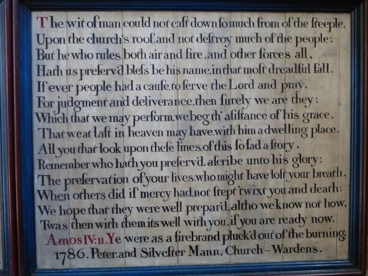 And then we have the curious case of the church tower struck by lightning. This inscription is painted across four boards in Widecombe Church, recording a catastrophe from 1638, when lightning struck the church tower. It happened on a Sunday afternoon, when people were singing in the church; the strike split open the tower, showered the congregation with debris, and burnt some worshippers alive, while leaving others completely untouched. This, as you might imagine, became a focus for villagers to ponder upon the mysteries of God’s judgement and, indeed, his mercy. The account itself dates from 1786, and was made by the churchwardens Peter and Sylvester Mann, who created a kind of epic poem out of the event. Here are two of the panels and I’ll quote some extracts below.