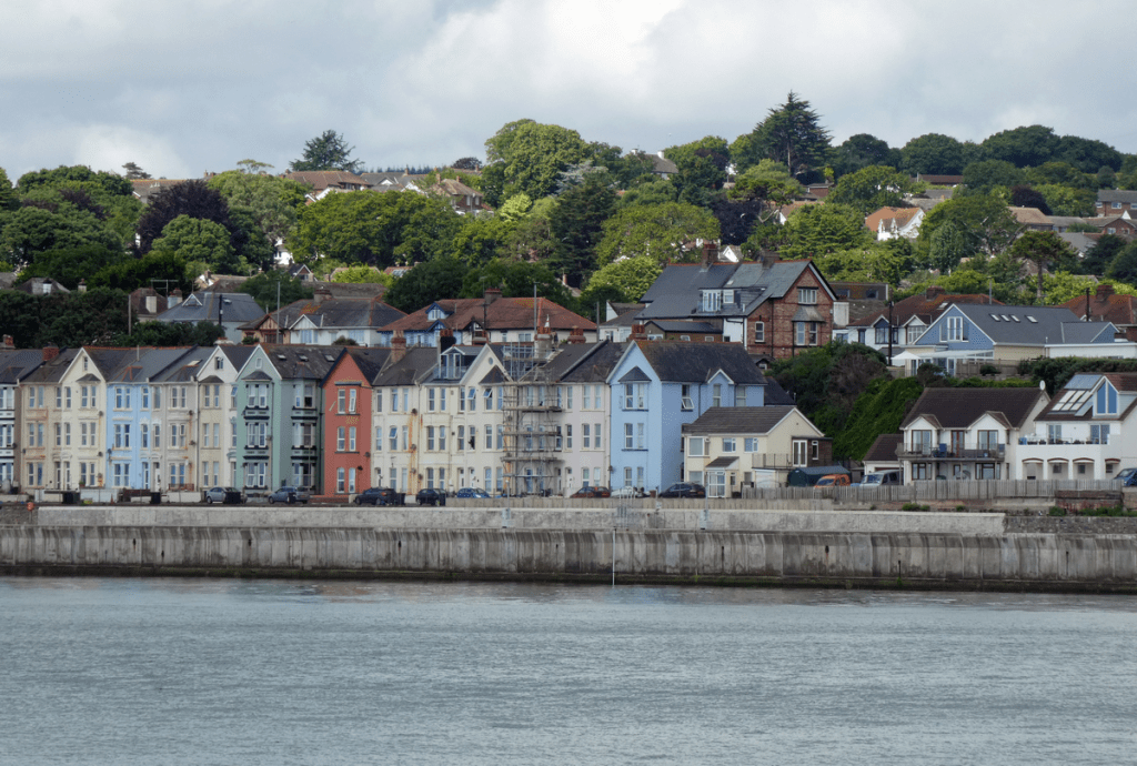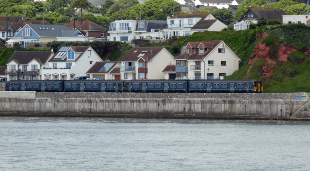 Caught on camera from our boat! The train running past the more modern seafront flats at Dawlish – it will then go right in front of the original terracesseen below.