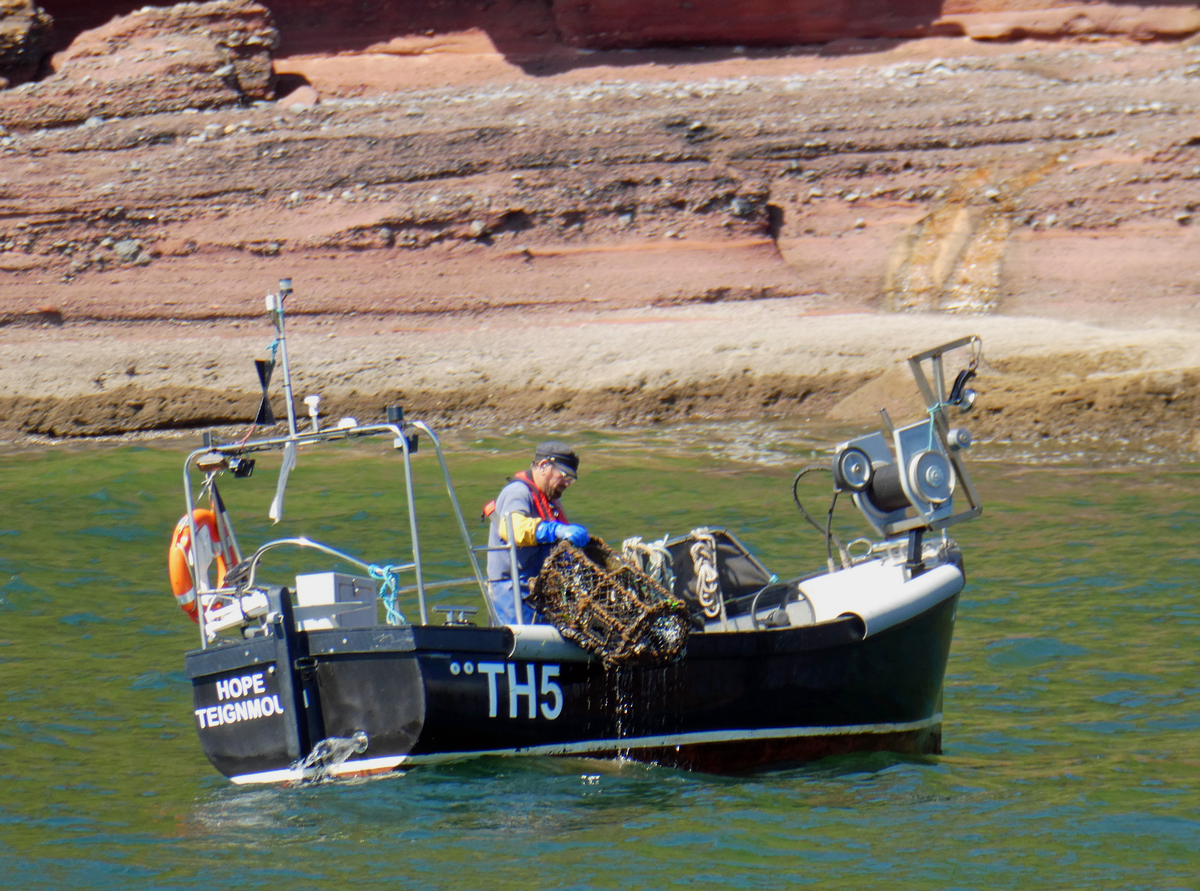 Below: some of the dramatic sandstone rocks near Teignmouth, and a local fisherman hauling in a lobster pot nearby