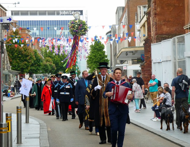 The wonderfully quirky tradition of parading a big white glove through city centre streets was today maintained in Exeter. Lammas Fair was celebrated in Exeter and at the end of the occasion, the big white glove was hoisted high above Exeter’s historic Guildhall, where it will remain for the next three days. Today’s Lammas Fair saw colourful pageantry in the heart of Exeter. The event got underway at 11am, with the Lord Mayor’s procession of the Lammas Glove, including civic dignitaries and Morris dancers departing from the Civic Centre.