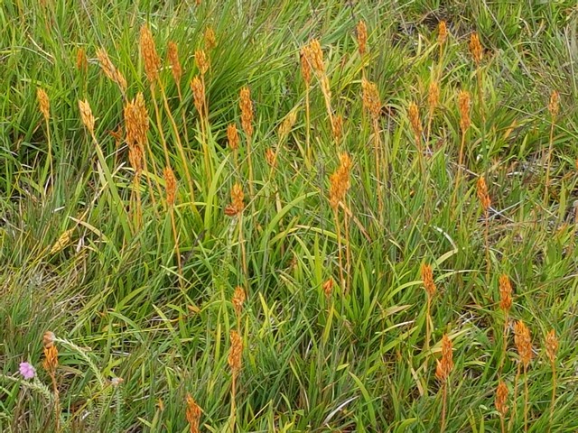 Woodbury Common is our nearest bit of wild countryside, a patchwork of village commons that have survived as one stretch of open heathland. At one point after the war they were threatened with becoming a municipal rubbish dump – now they are protected, and carefully managed to preserve flora and fauna. We have often walked over different areas of them. It’s surprisingly easy to get lost! But every now and then, you maybe be able to orientate yourself by a glimpse of the sea. In the pictures below, you can see Bog Asphodel – I had to turn to the flower book to identify this one!