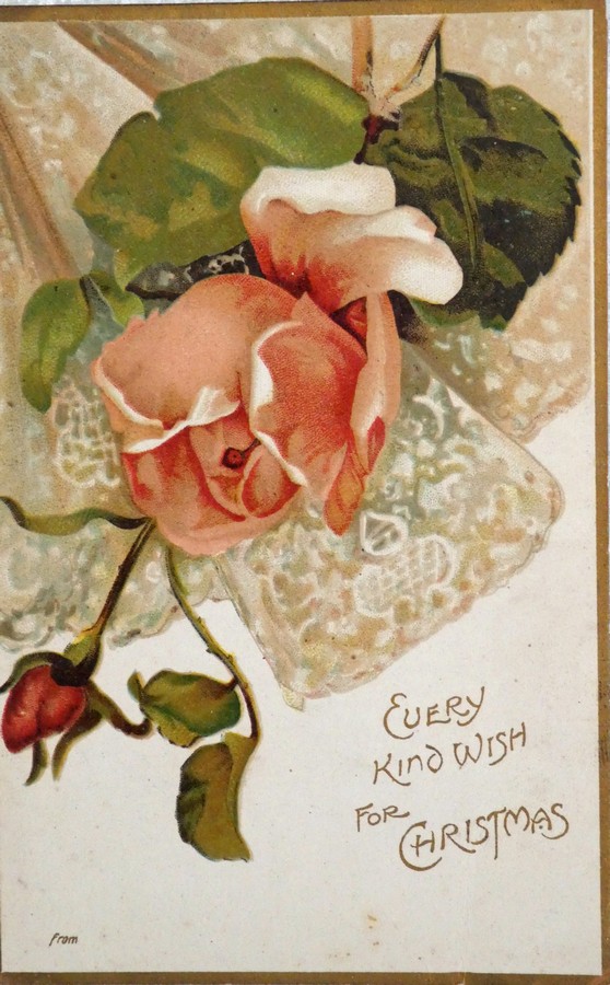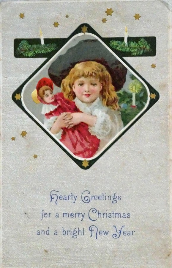 I have a collection of 45 old Christmas cards, dating from the late 1800s to around the 1920s. You might expect most of them to be decorated with colourful Christmas trees and little girls in bonnets, like the one above, but the majority are nothing of the kind. Some are safe and dull – holly was popular and uncontentious, but some are very curious indeed, pushing the Christmas card boundaries before the genre had really come into its own.