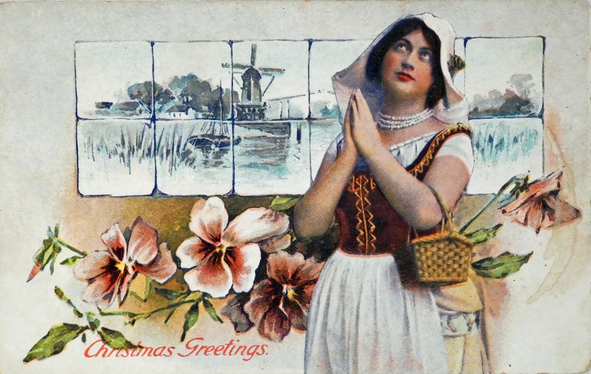 You might also be wondering why there are so many Dutch girls in these cards – to which I have absolutely no answer. This one appears to be selling roses or possibly tulips against the background of a storm at sea. Not very ‘bright and merry’ out there on the water.