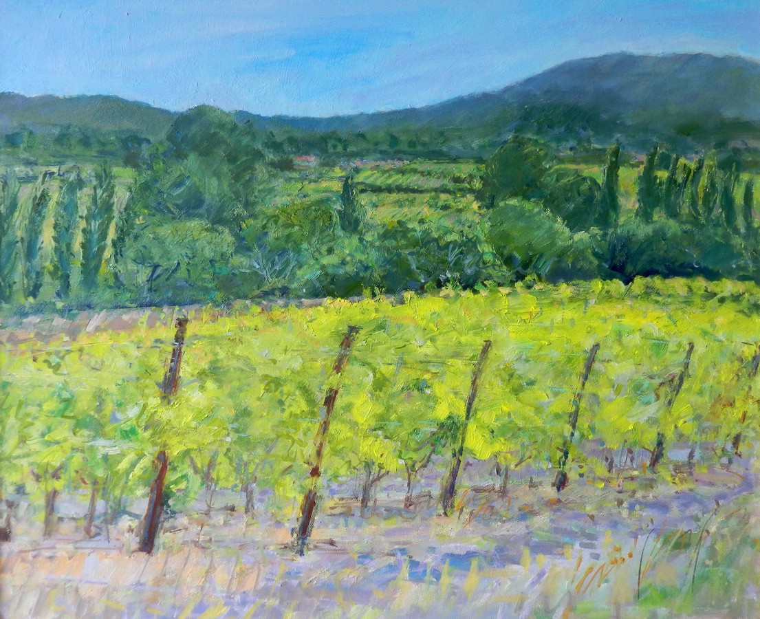 Robert and I have been at Mas la Chevalerie for several weeks now. We’re staying in a gite on a ranch owned by retired actors Bill Homewood and Estelle Kohler on an extended stay to paint (Robert), write (Cherry) and enjoy the landscape of the Languedoc and the Camargue. It’s September in the South of France, and the grape harvest is coming along, in this idyllic spot. And so is Robert’s art – Bill has helped him to set up a makeshift studio in his capacious office, where he (Bill) also records audio books for Naxos.