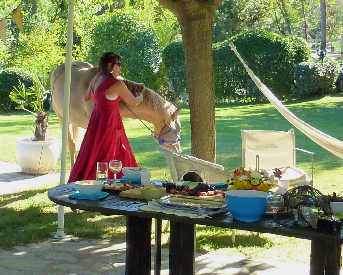 The pictures are up, the guests arrive. ‘Everyone will come,’ we’re told. ‘They love a chance to socialise and have an apéro.’ They do, and they mingle, looking carefully at the paintings first– some sales are made – and then it’s time to get down to the serious business of eating and drinking. The party grows merry – why not let the horses join in the fun?